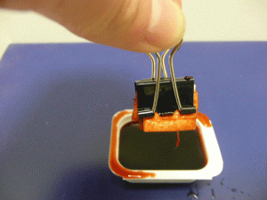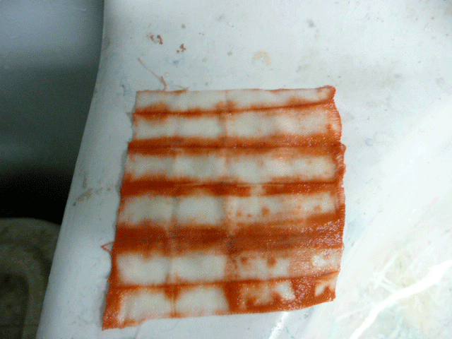 Today I had a couple of little projects going. I took a square of silk (14 x 14) and folded it up and wrapped it around a piece of wood. Then I bound it with some flat sinew, a waxed polyester thread. I mixed up some sage green procion dye and dipped the silk tied stick into it. I added washing soda because I didn’t have any soda ash. I’ve heard you can use it instead of soda ash in a pinch as long as you use a lot of it. Then I mixed up some rust orange –ooh one of my favorites. So that’s when other ideas started to percolate in my head and I went off on a little dye tangent. I love tiny things and I really love tiny binder clips. I had a tiny tub of strawberry jam and all of a sudden I thought about dyeing a tiny bound piece of cotton in the tiny empty jam tub. So I just start cutting things up and pouring dye and well here it is.