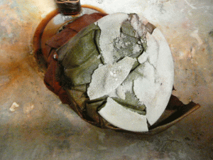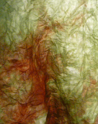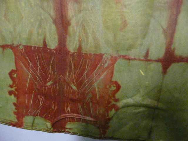 Some of the washing soda got petrified and stuck on the cotton in the big dye pot. The hardened soda preserved the sage green dye even after the rust was poured in. cool!