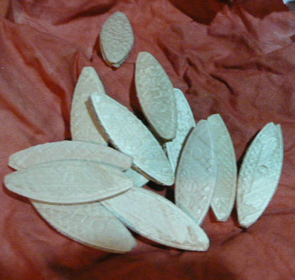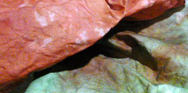 It’s Monday and here’s what happened last night. I was on my way to bed and passed by my workspace and saw the two dyed pieces from last week. Happy. so I went back upstairs and picked up the piece I dyed and painted, got out my biscuits, some discharge paste and got to work. I put a piece of two-sided tape on the biscuit and stuck it to my finger. Then I painted it with discharge paste and stamped a pattern on the cloth. You know sometimes you have to just keep going.It was dry this morning when I woke up, but I had to go to work and couldn’t find my respirator so I will have to wait until this evening to see how it turns out. It’s still wet in the photo. The stuff smells like sulfur. I’ll steam it with the iron later. Near the open window and use a fan for exhaust and a respirator.