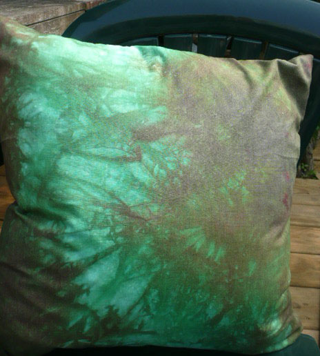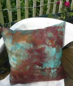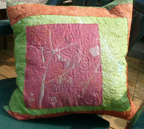 This is the back of the quilted pillow I made last night. this is from one of the first pieces I ever dyed with procion. Here is the front -I started with the center piece I quilted on tuesday.machine quilting is a gas!!! Here’s the other one I made last night.-back and front.