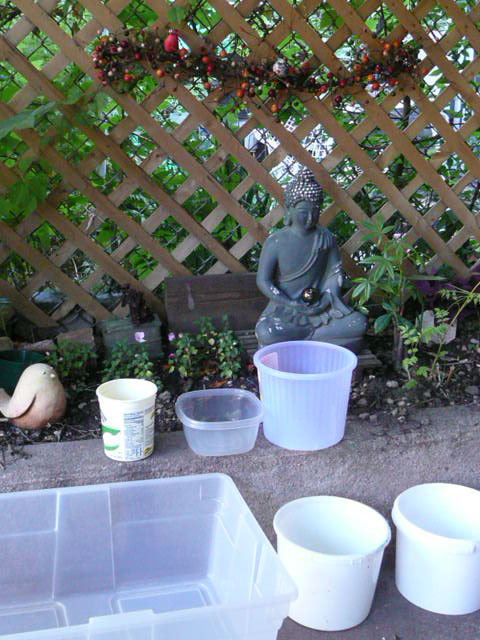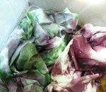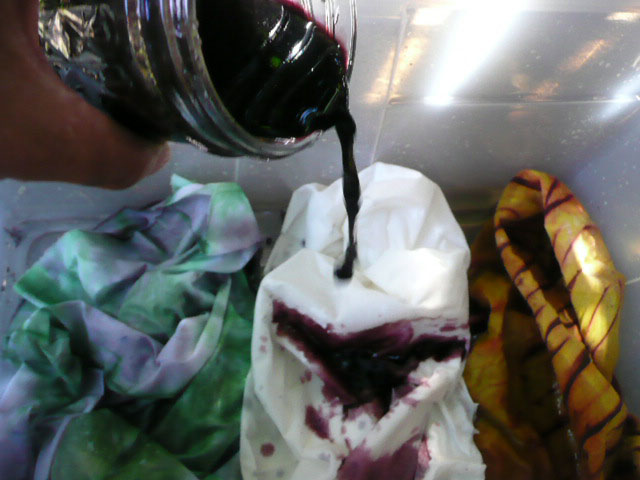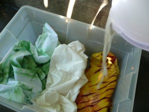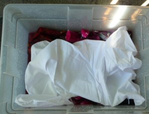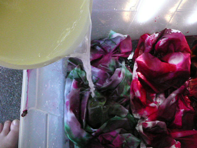 I had two pieces I dyed a while ago and I wasn’t crazy about them so I put them into the big tub along with some sand-washed cotton. I mixed up some urea water-I haven’t used it in a while and wanted to try it again. I think it is supposed to make the colors brighter- it’s liquid nitrogen and needs to be mixed up in warmer water because it gets really cold.