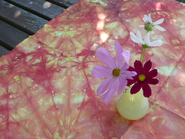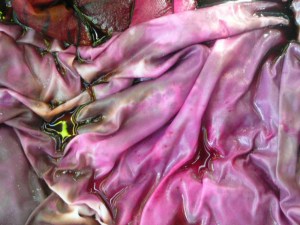 I mixed about a heaping teaspoon of grey blue and poured it over the white piece with the green markings-then dusty rose over the cotton and a bit on the yellow shibori linen. then fuschia over the whole thing. Next a piece of Sateen thrown on top and mink brown over that. Swished it around a few times and now I’m gonna leave it and go grocery shopping. It’s very hard not to use green, but I’m gonna try to control myself. See ya later!