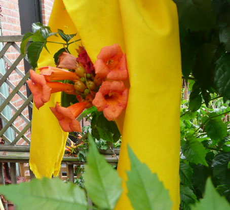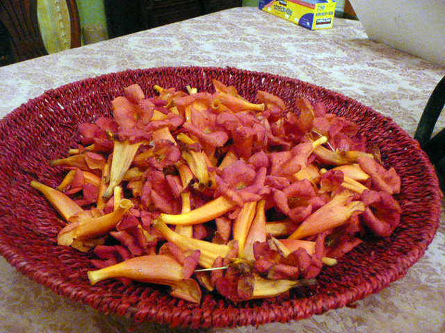 Last night I wanted to see if the orange trumpet flowers from my trumpet vine would produce orange dye. They were all over the deck and back yard, so I took my basket out and filled it up.