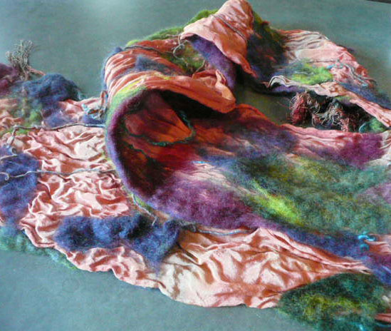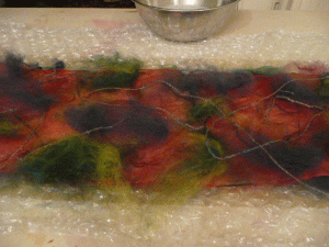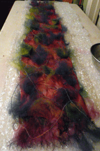 So you see I laid it all out on bubble wrap, wet it with soapy water, and rolled it up. I rolled it back and forth for about 45 minutes on and off. Everything got really soapy. Maybe I used too much soap. My hands, the wrap and the table were slippery and that made everything a bit more difficult I think, than it had to be. Next time I will use less soap. Here’s how it came out!