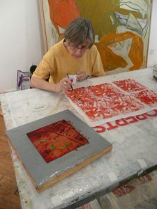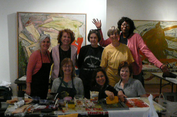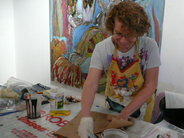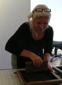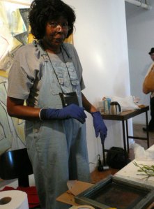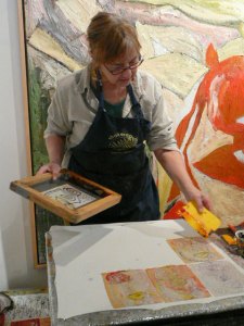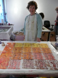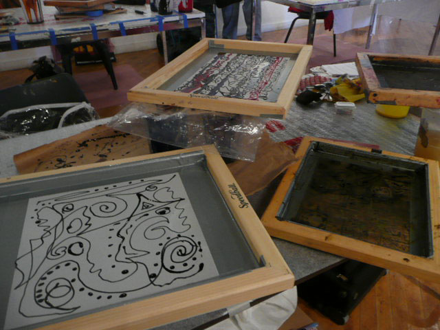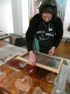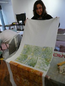 We had a wonderful time this weekend learning Deconstructed Silkscreen Printing (DSP) with Kerr Grabowski. (Check out the video on Kerr’s site.)Kerr developed this very cool way to make your mark on cloth and paper. We used thickened dyes and lots of found objects and we let it all dry in the screen. I can’t tell you how freeing it was for me since I’ve spent the last 40 years trying to not let anything dry in a silkscreen. Here are some more photos of our lovely group and our creative process.
