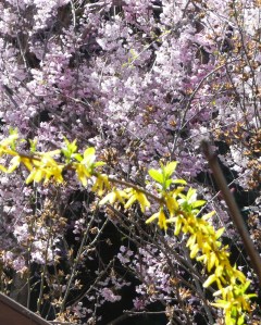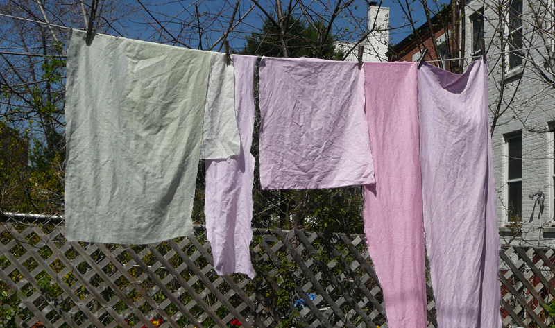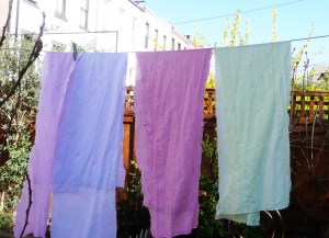 I did a bunch of strips of linen. I’m planning to make two pojagi style skinny curtains for my two long skinny windows on either side of my door. They all came out kind of Easter eggy and they match everything that is blooming in the garden right now. But I didn’t realize that until I hung them all out on the line.