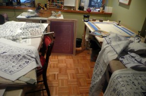 I have been burning screens and pulling proofs most of today ARGH! You would think after 40 years I would have it down. 40 years ago we used lacquer stencils  and pressed them down with stacks of encyclopedias (sp?) in the basement. Oh the fumes! It’s a wonder I can think at all never mind spell correctly. Photo emulsion still seems like a new invention to me. It’s the end of the day and my studio is a mess. I don’t think I’m ready for my spread in Where Women Create just yet. Oh well.