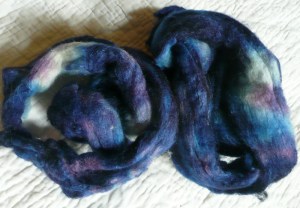 The first roving I dyed that I got impatient with and threw in some acid dyes looks pretty good too. I would really like to try to spin it. Or make some felt. Oh I feel another obsession coming on.