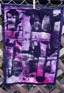 This is something I worked on last night. It is a small piece. All one piece of fabric- hand painted with dyes. Been wanting to quilt it for a while and I thought it would be a good practice piece. For some reason I call it jazz. Maybe it’s that big splotch on the bottom that looks like a musical note. I have a series of these in different colors. Some are on silk. I think I will try to finish them all up. This one still needs a bit of work and I may redo the border. A little too sloppy even for me.