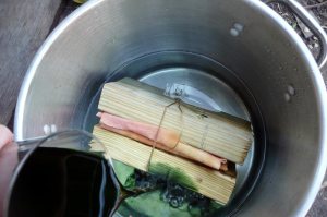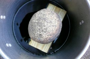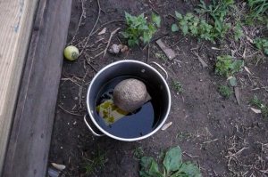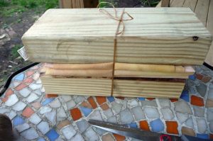 Did some dyeing today and it did me some good. There are so many small pieces of wood leftover from building the little house and I know just what to do with it. I had this piece of sandwashed cotton that I was not too crazy about so I decided to overdye it today. But first I folded and tied it up a little.I thought it might be fun to dye something on the little house porch but I didn’t want to spill anything on it just yet, so I settled for the ground near the porch. I brought out my dyepot about 1/2 filled with water, and a little cup with about a Tablespoon of Procion Avocado mixed into 2 ounces of water. I put the little bundle into the pot and poured the lovely green in. Of course it floated and I had to weigh it down with a rock I found nearby. I almost forgot to add the soda ash – it has been too long since I dyed something! But I remembered and mixed up about 1/8 cup into a quart of water and ran outside and poured it in.I went to check on it about two hours later. To tell you the truth I was a bit disappointed. (always a good sign) I didn’t unwrap it though and I will leave it til morning. I did bring it inside so that the raccoons would not get into it and make a huge mess. Sometimes when i use avocado and leave it a long while turquoise shows up and I’m hoping that will happen tonight. I may just dye it again in the morning. We’ll see. You know how I love second chances.