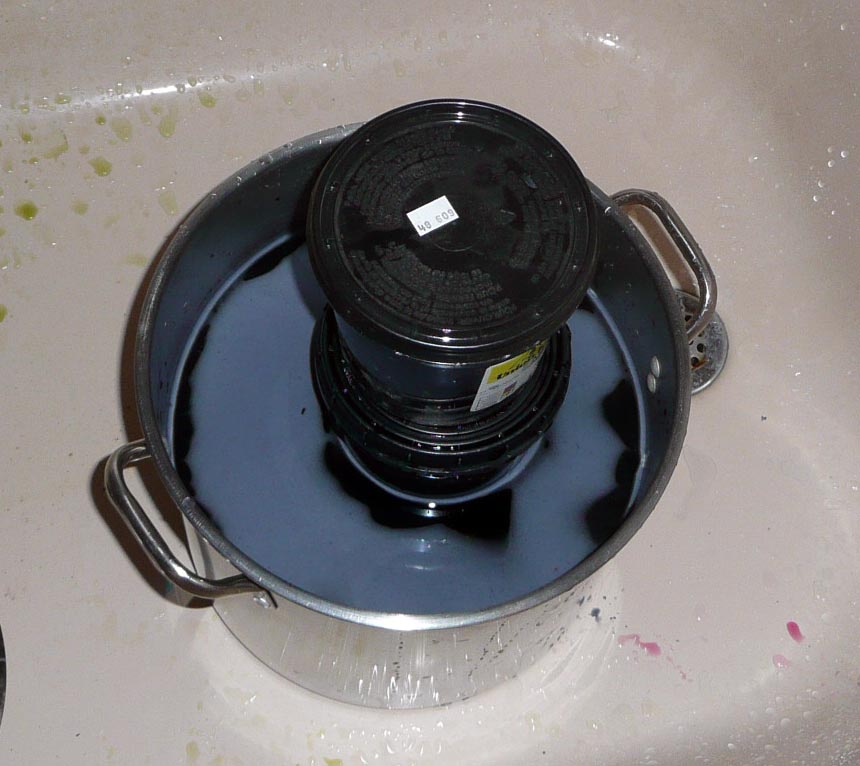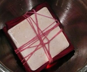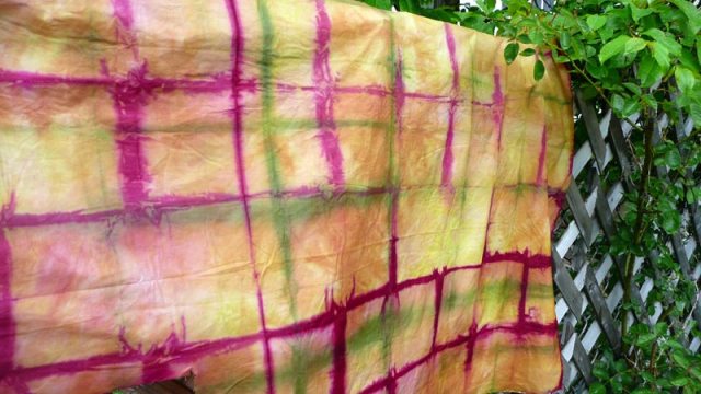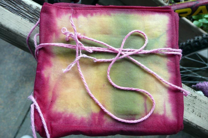 And back into a black dye pot folded and weighted down. So fearful that I am ruining it because I’ve gone too far. It’s taking all my concentration not to just dump the dyepot. Instead I think I will add more dye. I want it to be nice and dark. Soda was added.