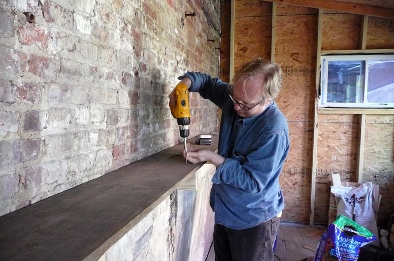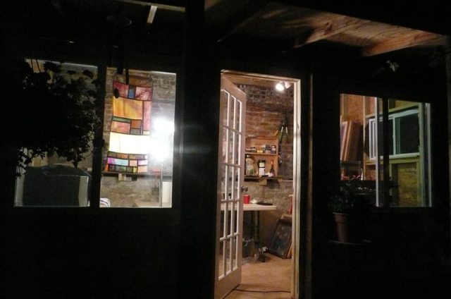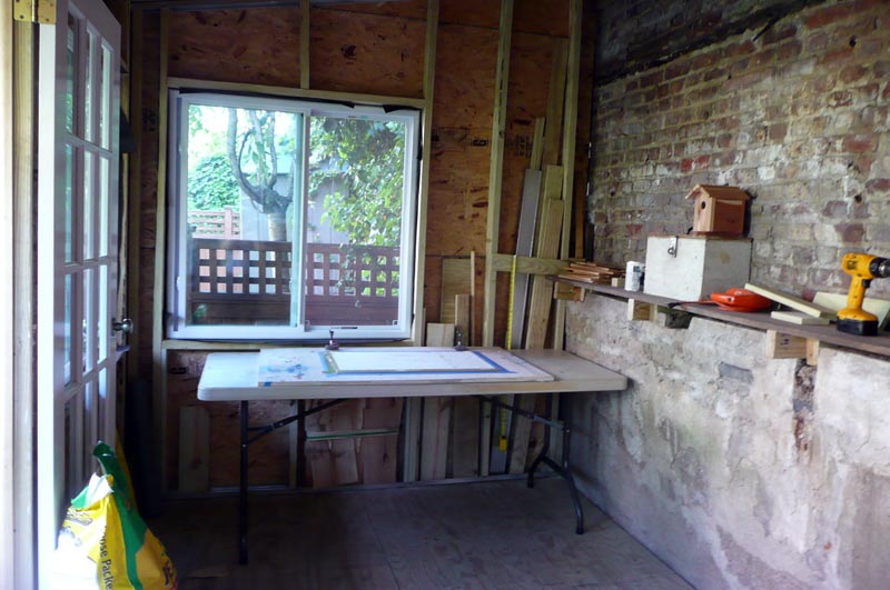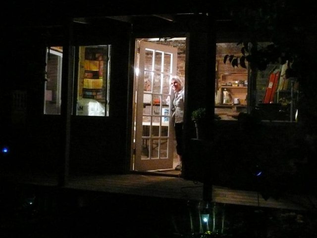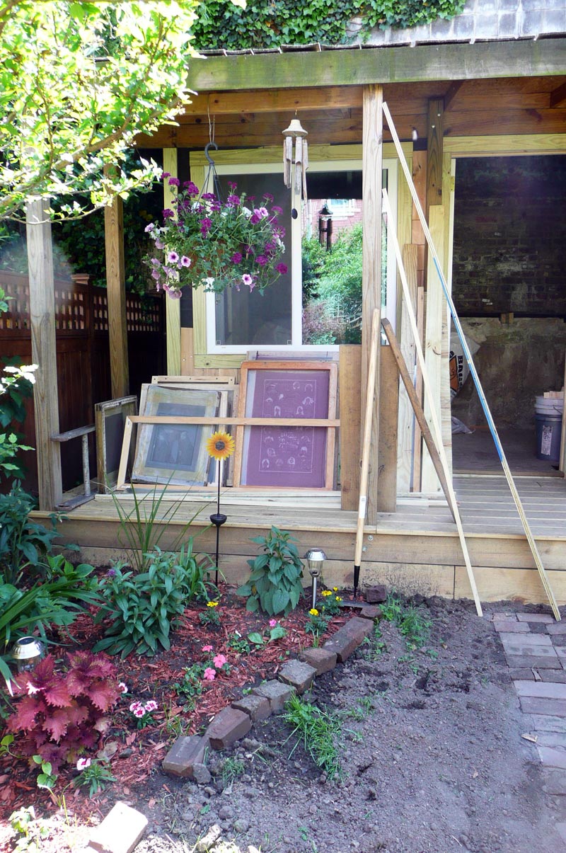 Peter made this great shelf with a huge plank leftover from the old shed. I think I am really going to like working in here. tonight I printed a few T-shirts and it felt good. I hung Laura’s pojagi in the window. I’m so glad she is back from Portland. It’s been a long great day. goodnight.
