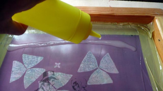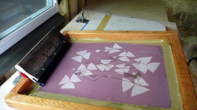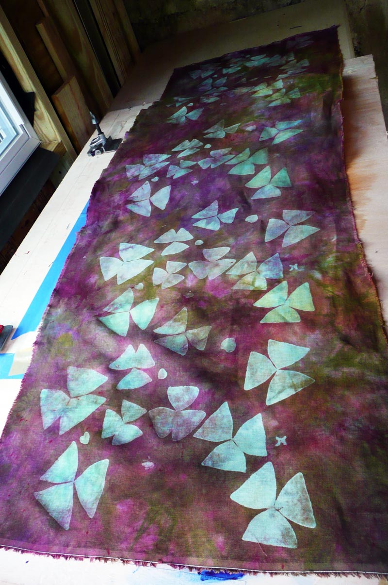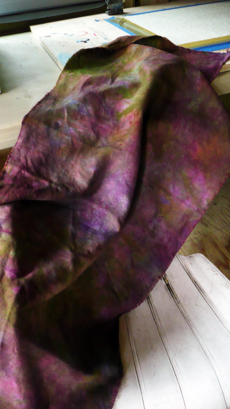 I put that in the bottom of a mustard container I got at the 99c store. Then filled it about 3/4 with the smelly alginate. I shook it up, was really happy that it didn’t explode (just kidding) Now it is really smelly!I used the oxalis screen and set it up in my new workshop! I was rummaging around in my stash and found the perfect piece of linen to do my experiment. I dyed it and overdyed it a while ago. It’s very beautiful as it is, but I want to mess with it anyway.Here I go printing the discharge paste onto the linen. It is really smelly and I have to open the window. thank goodness I have plenty of those in the new space.