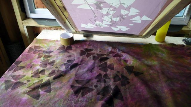so as I screen I move the fabric over -it’s not a perfect repeat, but it will do. the discharge looks very dark because it is still very wet. I usually don’t let it dry before i steam it with the iron. Now it is starting to come up from the steam! YES it is green as I hoped!! I still have to wash out the residue from the alginate so it may change a bit. I will let you know. But here is what it looks like now!