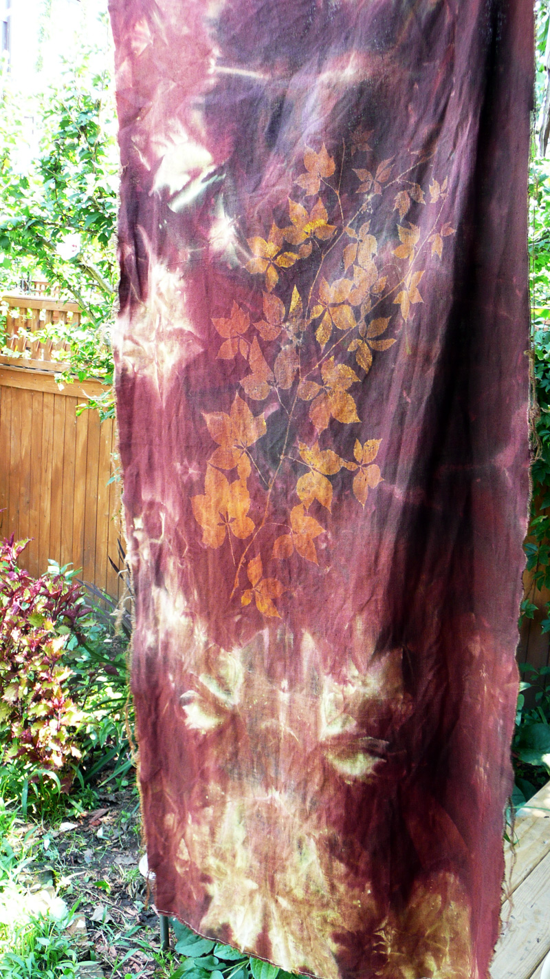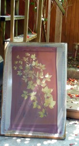 I pulled some vines and placed them on the exposure unit and then I coated the biggest silkscreen I had in the shop and burned the vine image on it. It came out so much better than I’d hoped. I dyed a piece of very heavy linen cotton. It is almost like a duck. I used tangerine, mixing red and black. I printed it with a ready made discharge paste that is supposed to leave color behind. this one was called autumn gold or something like that.