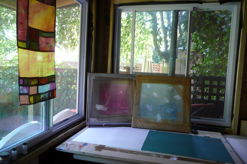 What a wonderful glimpse into your studio! Love the quilt hanging.