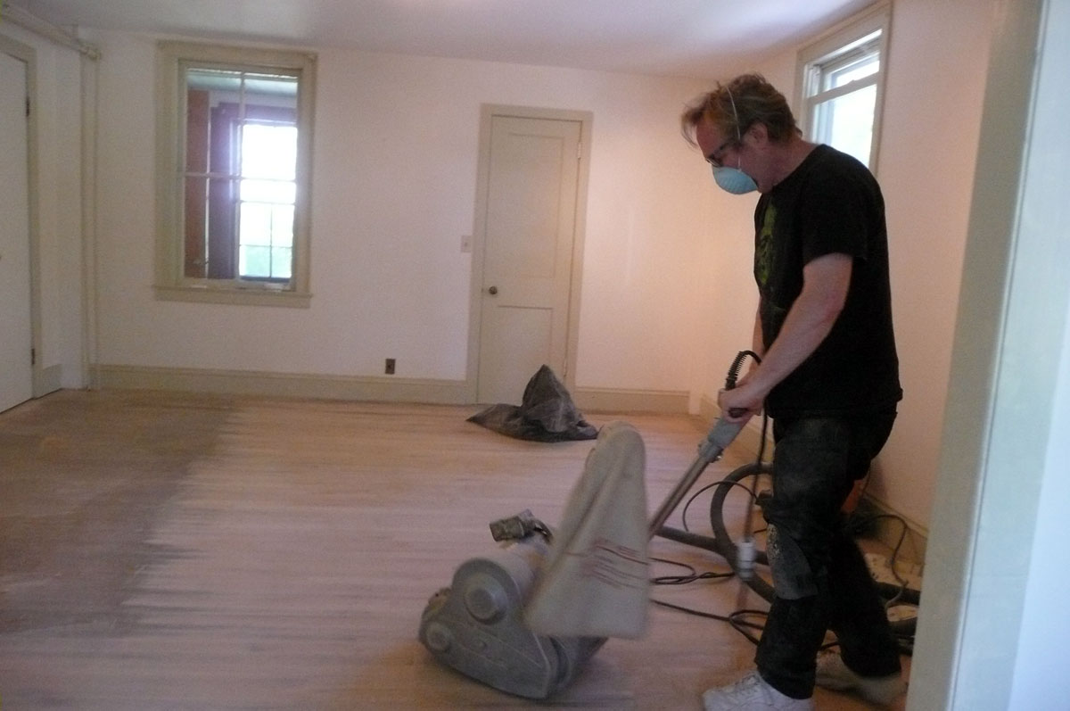 First we took up all the linoleum. Then Peter scored the plywood sub floor dividing it up into 12″ (approx) squares. We had to pry it all up and pull out about a gazillion nails. The beautiful oak floor was then revealed but it needed to be refinished. So all day yesterday and today, Peter is sanding the floor. three passes with different grades of sand paper course to fine and the edging too. We are both ecstatic about the floor. I just have to show it to you, it looks amazing!