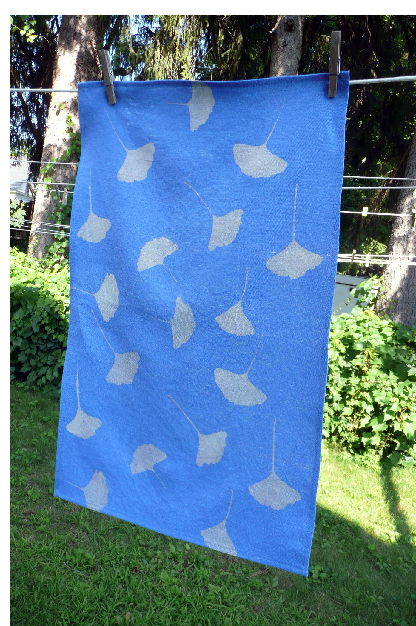 Discharged with thiox and real ginkgo leaves. The color turns to gray. Gray is an awesome color -I can never mix it quite right, so grateful to the blue for revealing it!