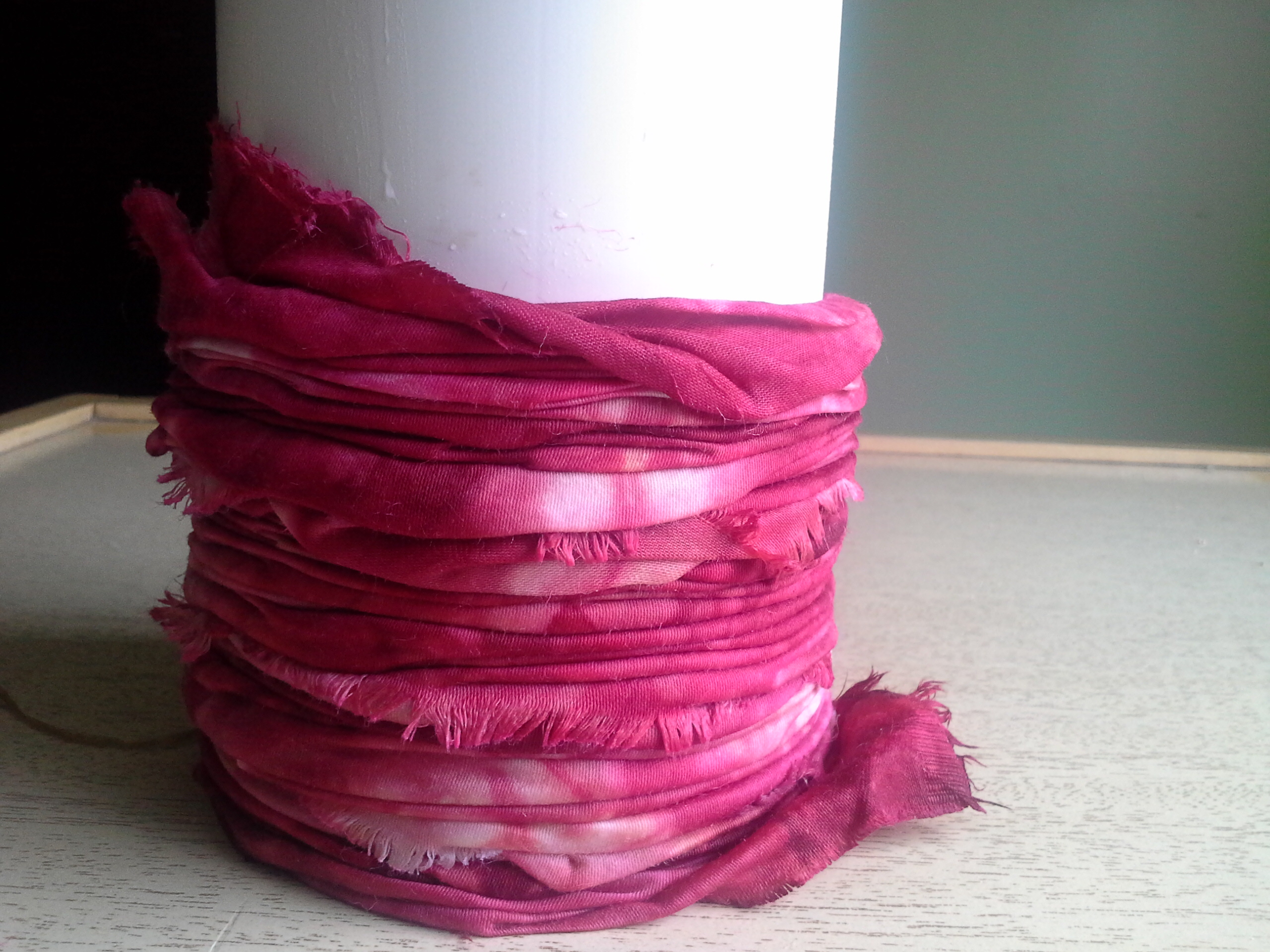 now wrap twine around the fabric. Just tie Iit around the first time and keep wrapping fairly tightly leaving about 1/2 inch between rows. Sort of like this: