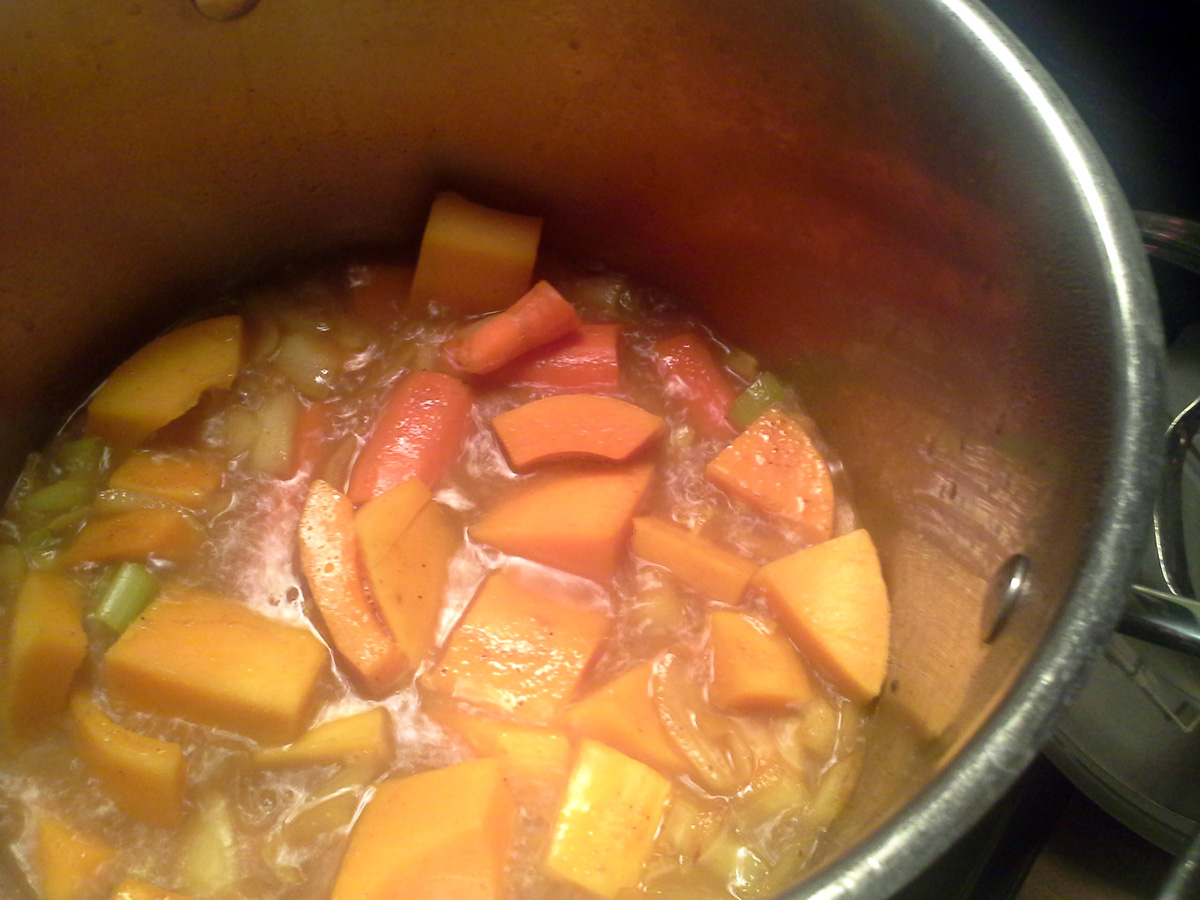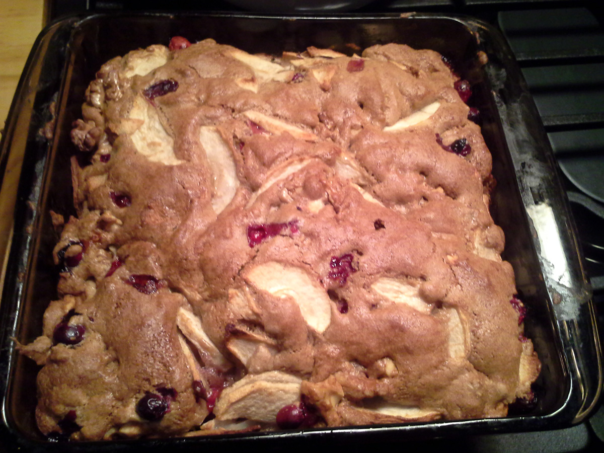 And now suppertime, butternut squash soup and cranapple walnut cake.soupcran Must be getting near the holidays! I always start the holidays off with this cake from Moosewood. Peter really did all the work, I just made coffee!