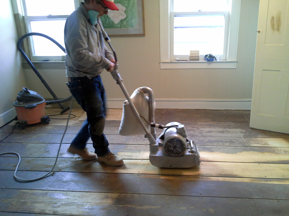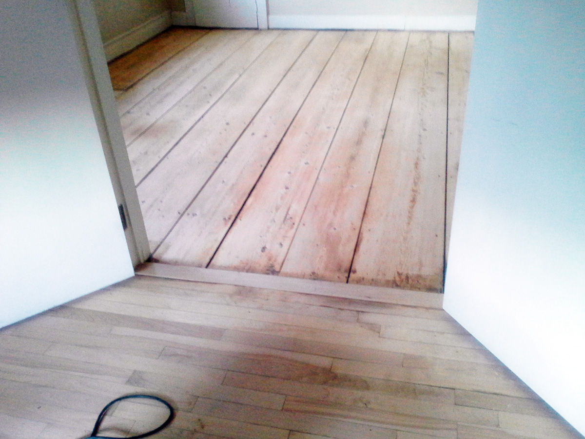 Here are both rooms sanded. The small room has oak and maple and the big room has big pine boards that span the entire length of the room