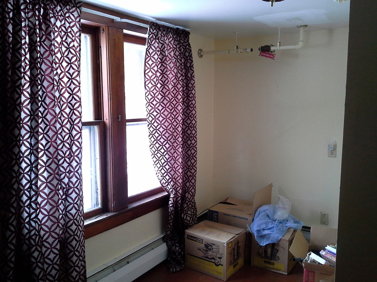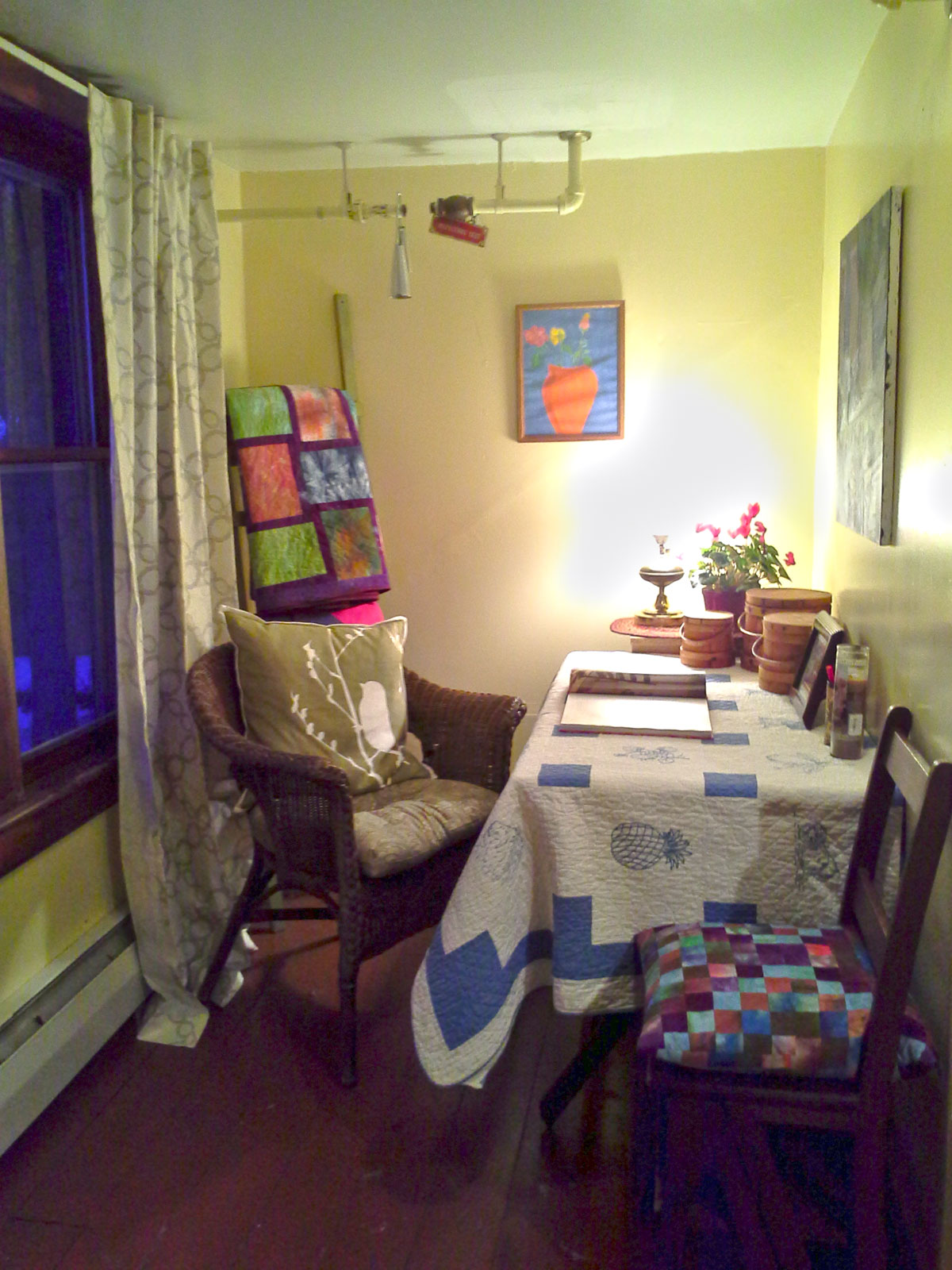 After!! The room is 63 inches by 72 inches! It has wonderful light with those two windows and a pretty view of my neighbors’ slate roofs, a snow covered hilltop and the giant evergreens behind my house. The quilts were in the cupboard, the chair on the porch, and the table was not being used anywhere. Its an outside redwood type table. This took me about two hours. So now tell me what are you going to do with that little space that YOU keep walking by in your house???!!!!