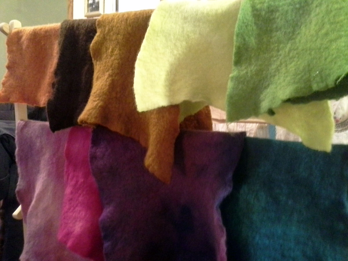 I’m so happy with my felt palette. I had so much fun dyeing these and they felted up even more in the dyepot. I used acid dyes and citric acid to set them. I just boiled each one individually and when the water was clear, I took the piece out and put the next one in
