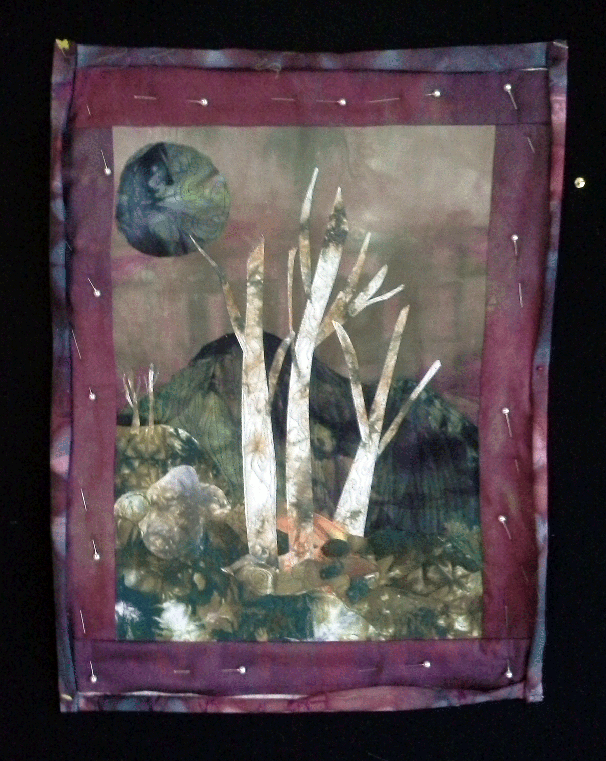 Well I worked on this new piece most of the day yesterday. I added some more hills in the background, change the moon, made the trees on the left smaller and took out the red house. I started quilting it and here it is so far. I ripped out some quilting I didn’t like -it wasn’t so hard! -Sometimes I will give up on a project if it’s not working, but I am going to keep going and quilt the sky next. I’m learning a lot from this piece and I am pretty happy with the way this is turning out.