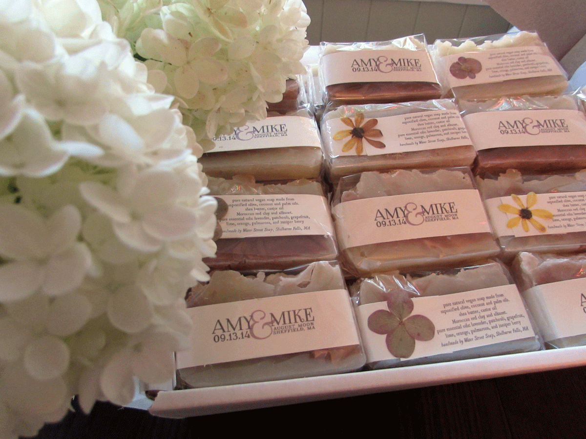 I made 80 bars and scented them with lavender and patchouli, Amy’s favorite. I colored them in Amy and Mike’s wedding colors using red Moroccan clay. I picked flowers from my garden weeks ago and pressed them in anticipation of the packaging.