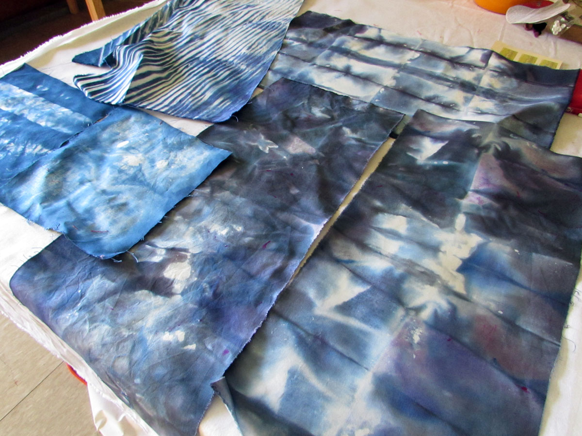 Well it all started on Saturday morning. I woke up very early and got a blue dyepot going with procion dyes. I’m dyeing to do an indigo pot but don’t have the indigo so I’m doing my best with mixing blue, periwinkle and blue gray. Here’s how it all went. I’m using white kona cotton, prepared for dyeing. (PFD)