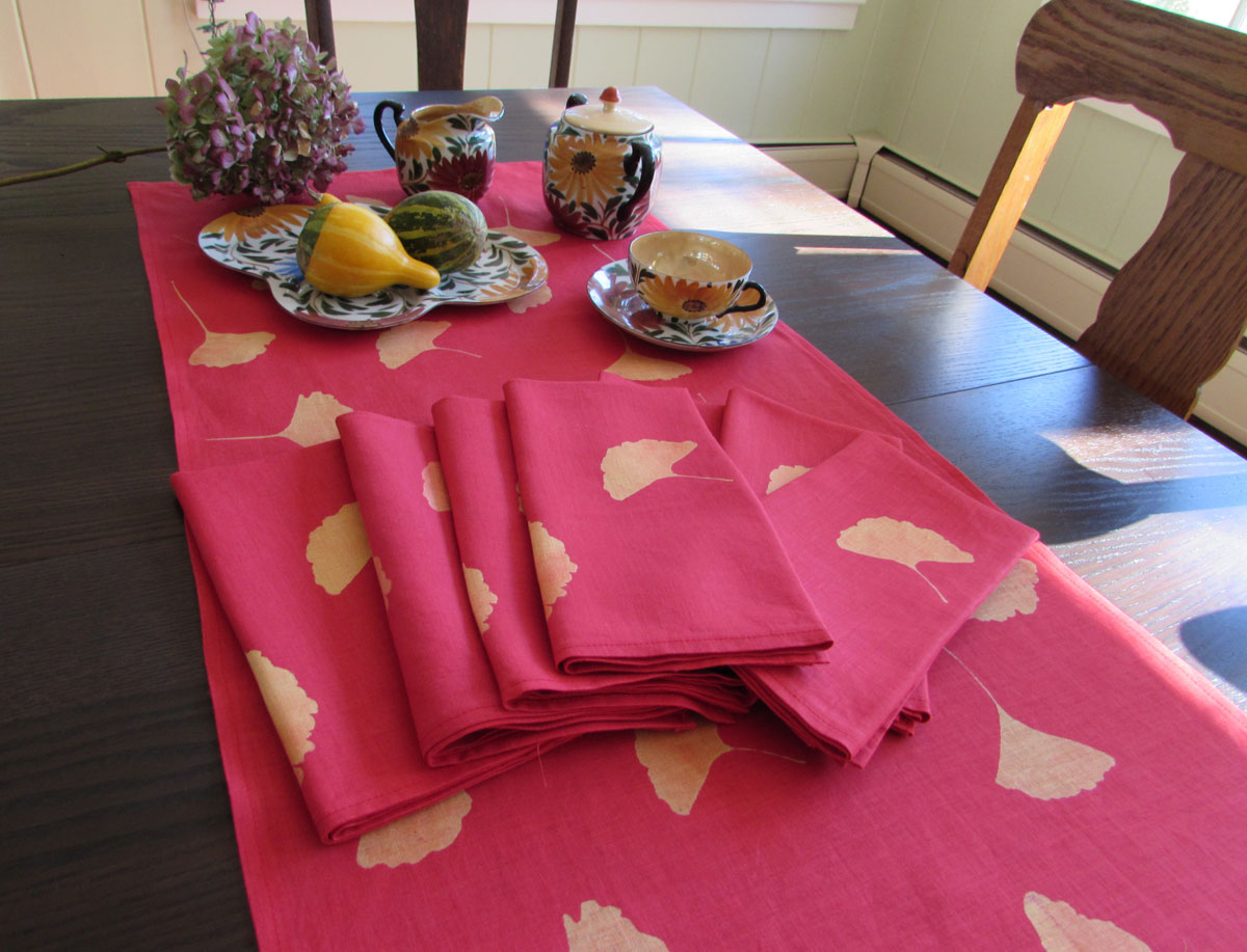 I finished a set of Gingko Table Linens. I silkscreened discharge onto red linen. This is a custom order for my dear friend Sally.