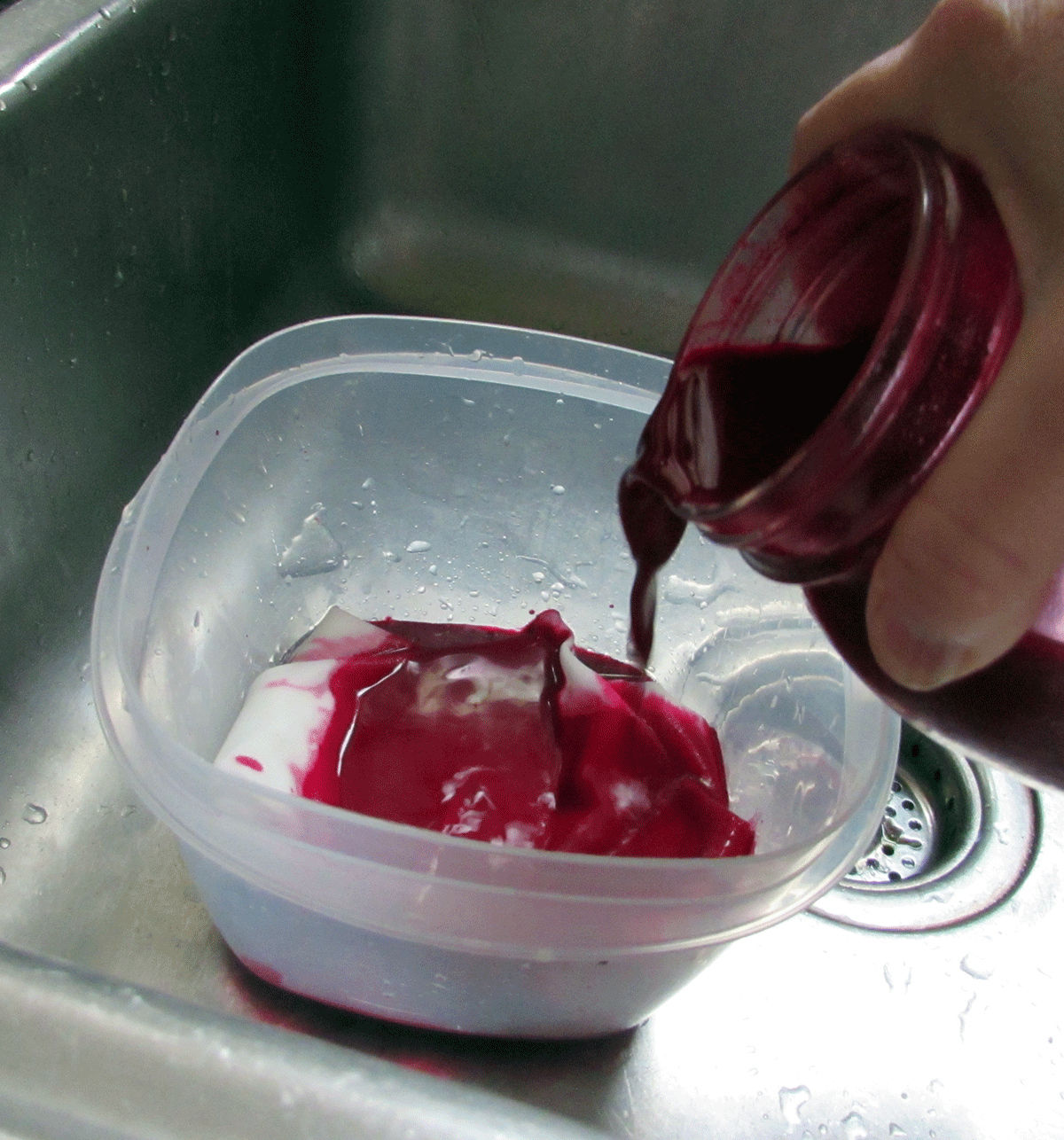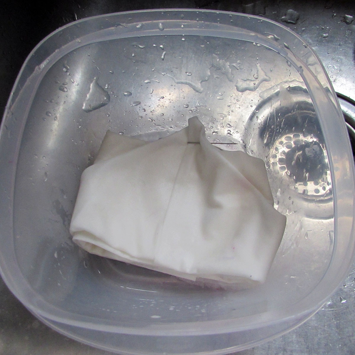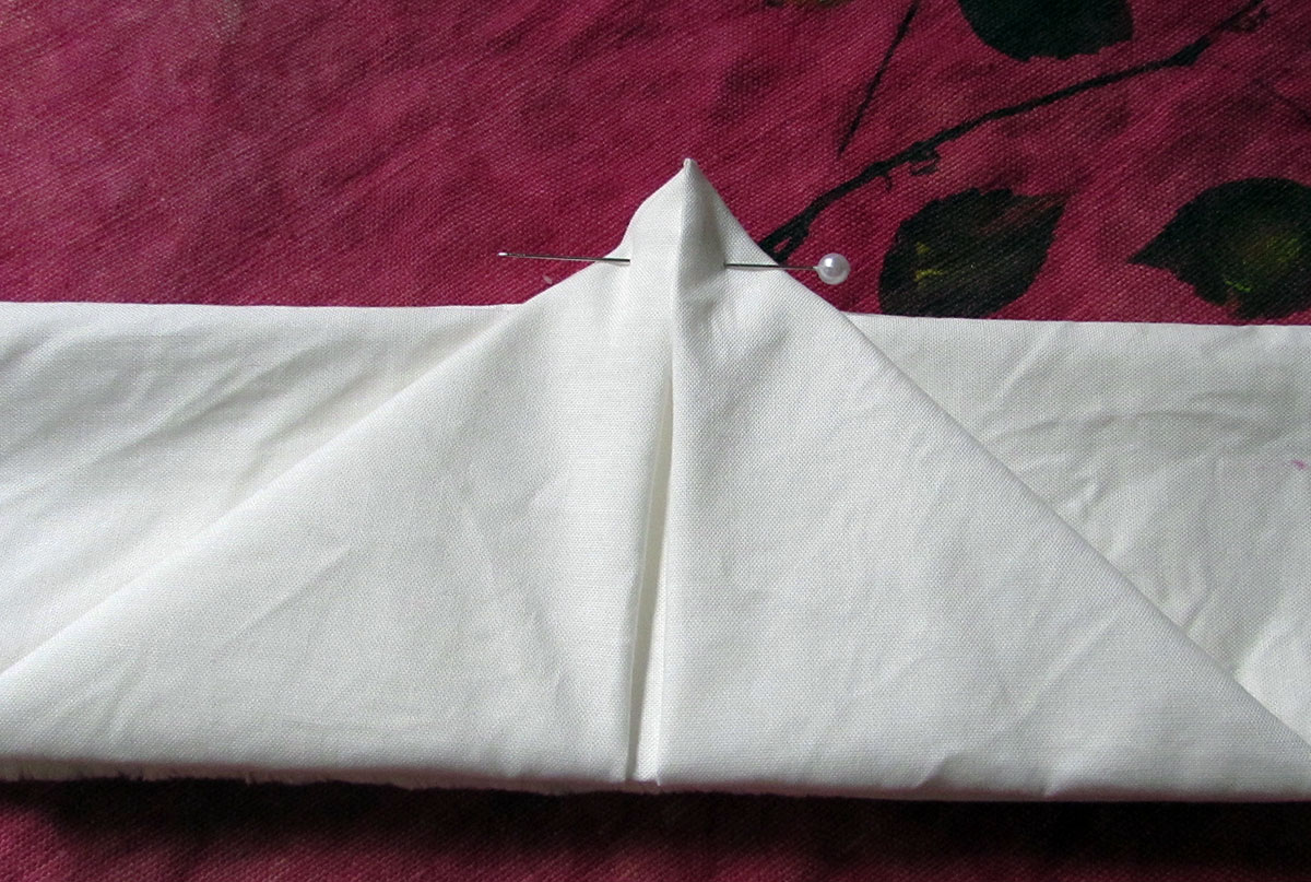 Here is my day one project. I woke up this morning and went through my stash for undyed fabric. I found this nice piece of white cotton something, maybe sheeting, I’m not sure. I folded it up kind of reminiscent of those little fortune teller paper games we used to make in grade school. I pinned it and well you know the rest!