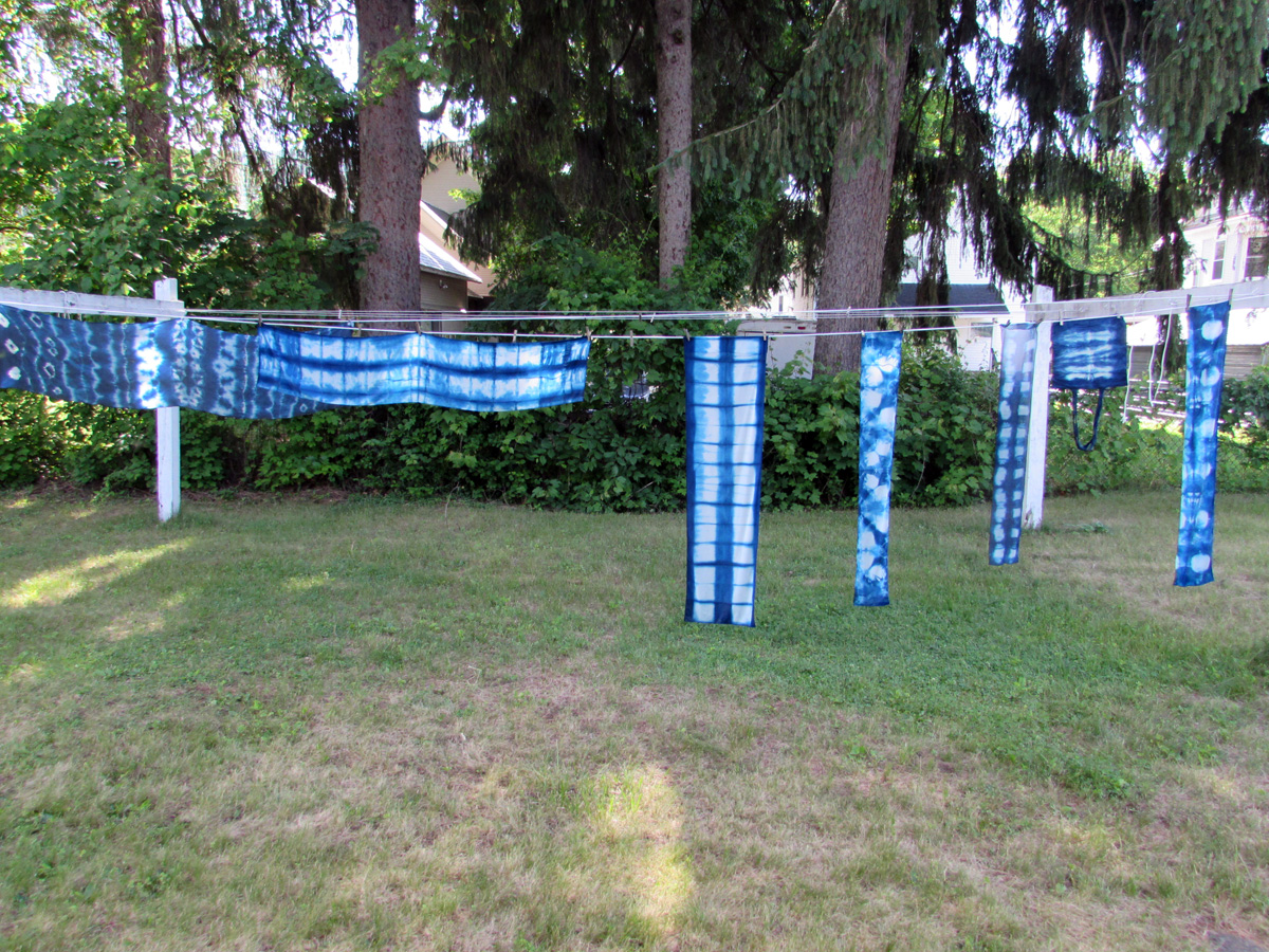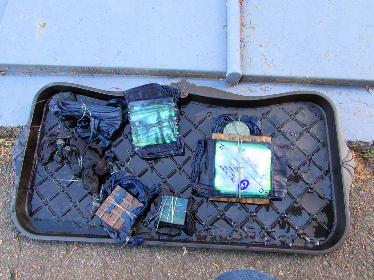 Indigo oxidizes when the air hits it. The pieces come out a very light chartreuse green and then before your eyes turn deep indigo blue once oxygen gets to it. So you want to keep air out of the vat. Don’t let stuff float and squeeze out all you can under water (with gloves on of course!) Have something nearby you can drop the work on. I used a boot thing I got from a discount store.