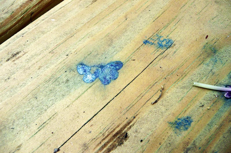 One other thing – Peter pointed this out to me the other day. It seems that flowers dropping from a basket above are dyeing the wood. I went out after a long rain and the images were still there. and they are blue! I’ve seen leaf prints before on concrete, but they are usually brown or black. I don’t know if I’ve ever seen blue before.